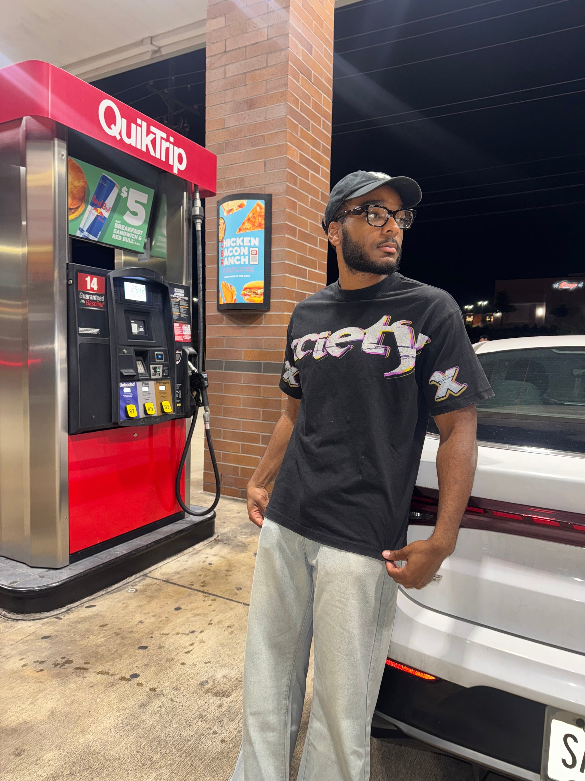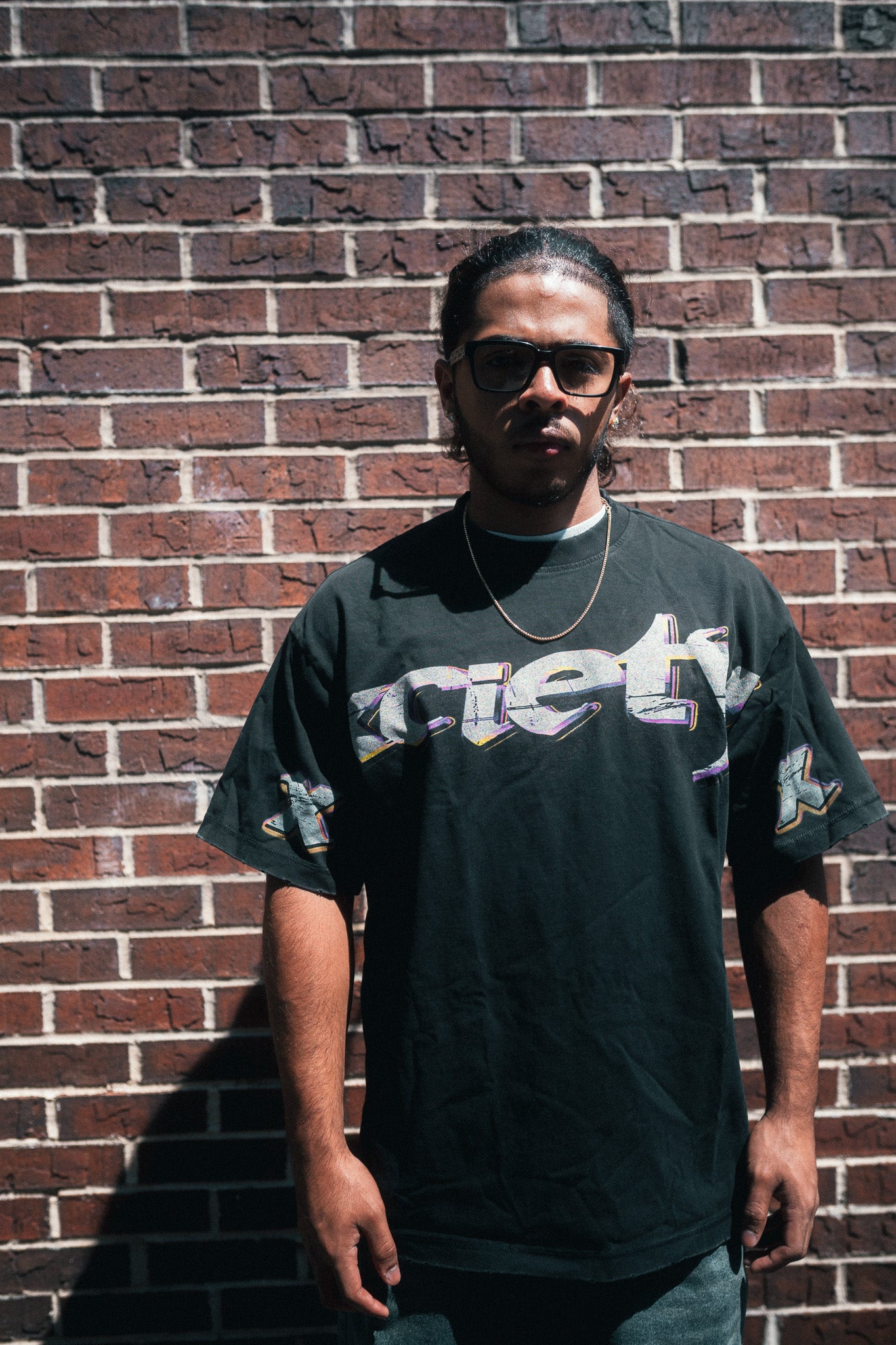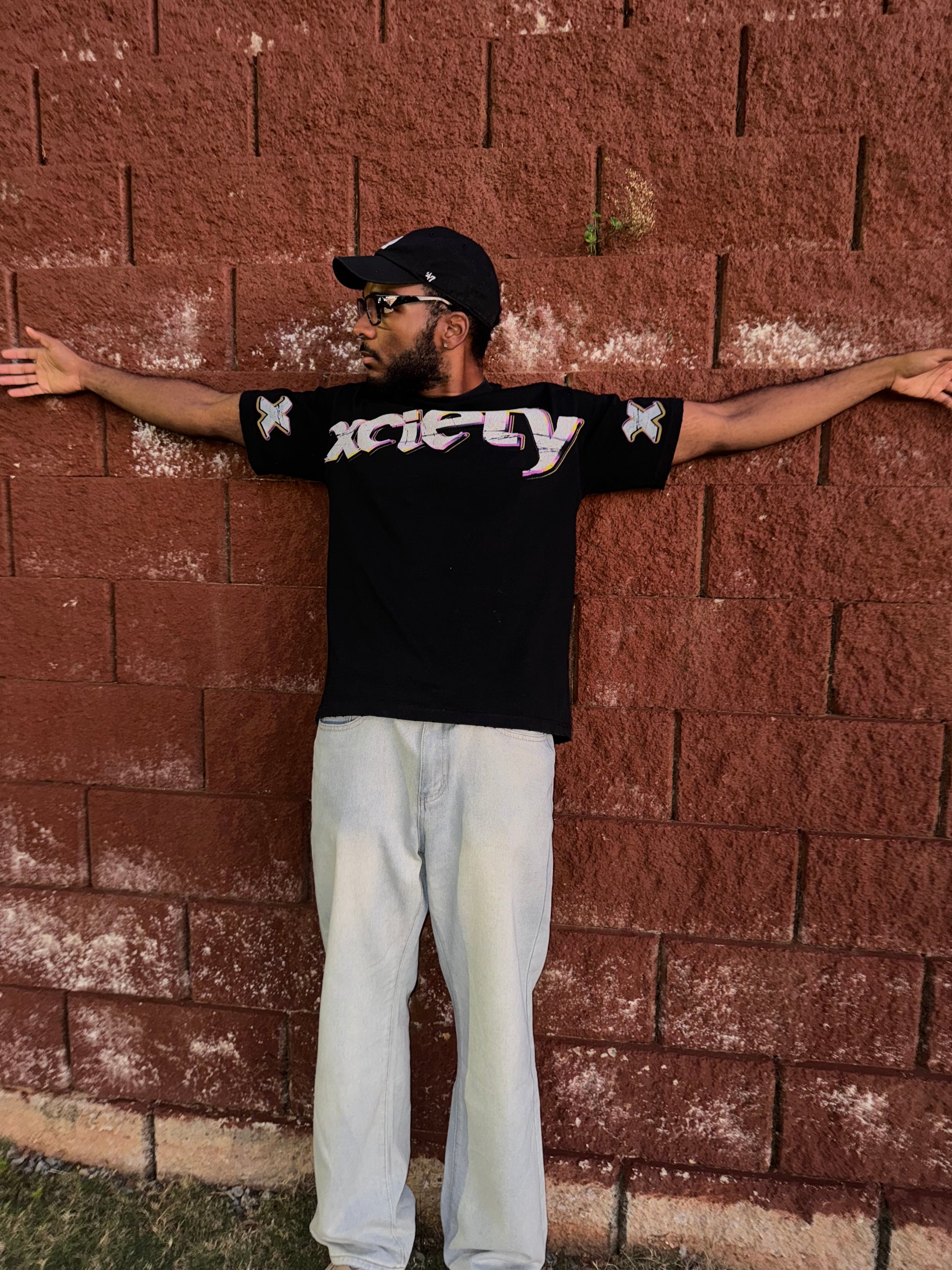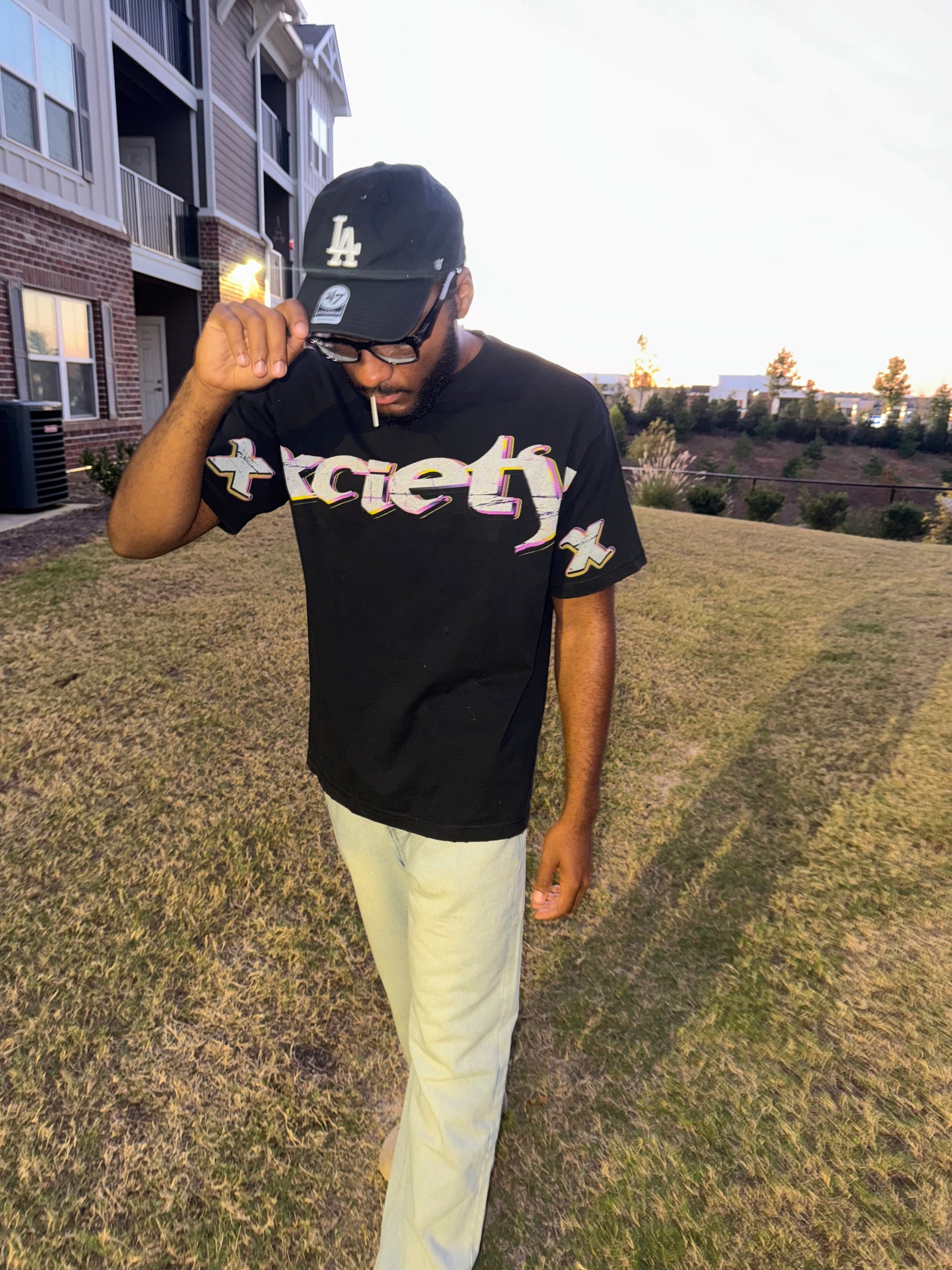 Shirt is made out of 250 GSM heavyweight cotton, with a sun faded and distressed effect to it made in China. This piece entails Xciety printed across the chest with the brand logo angel flying across the back.