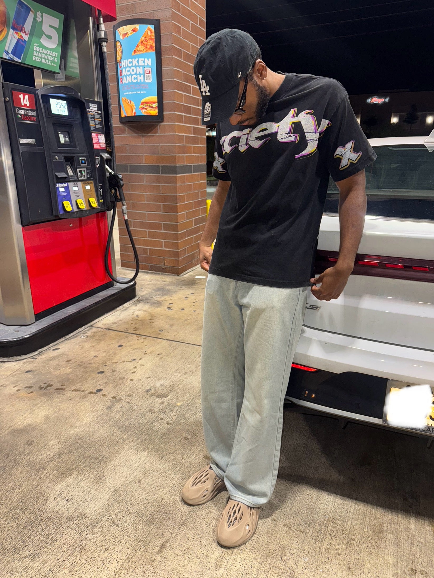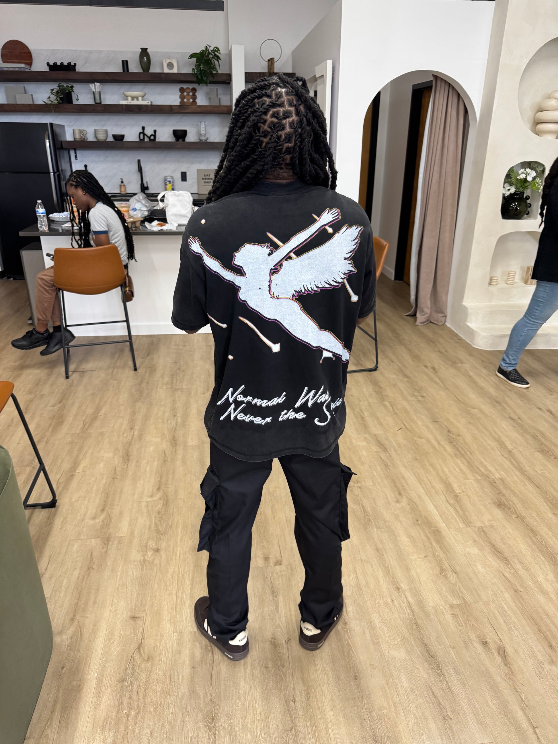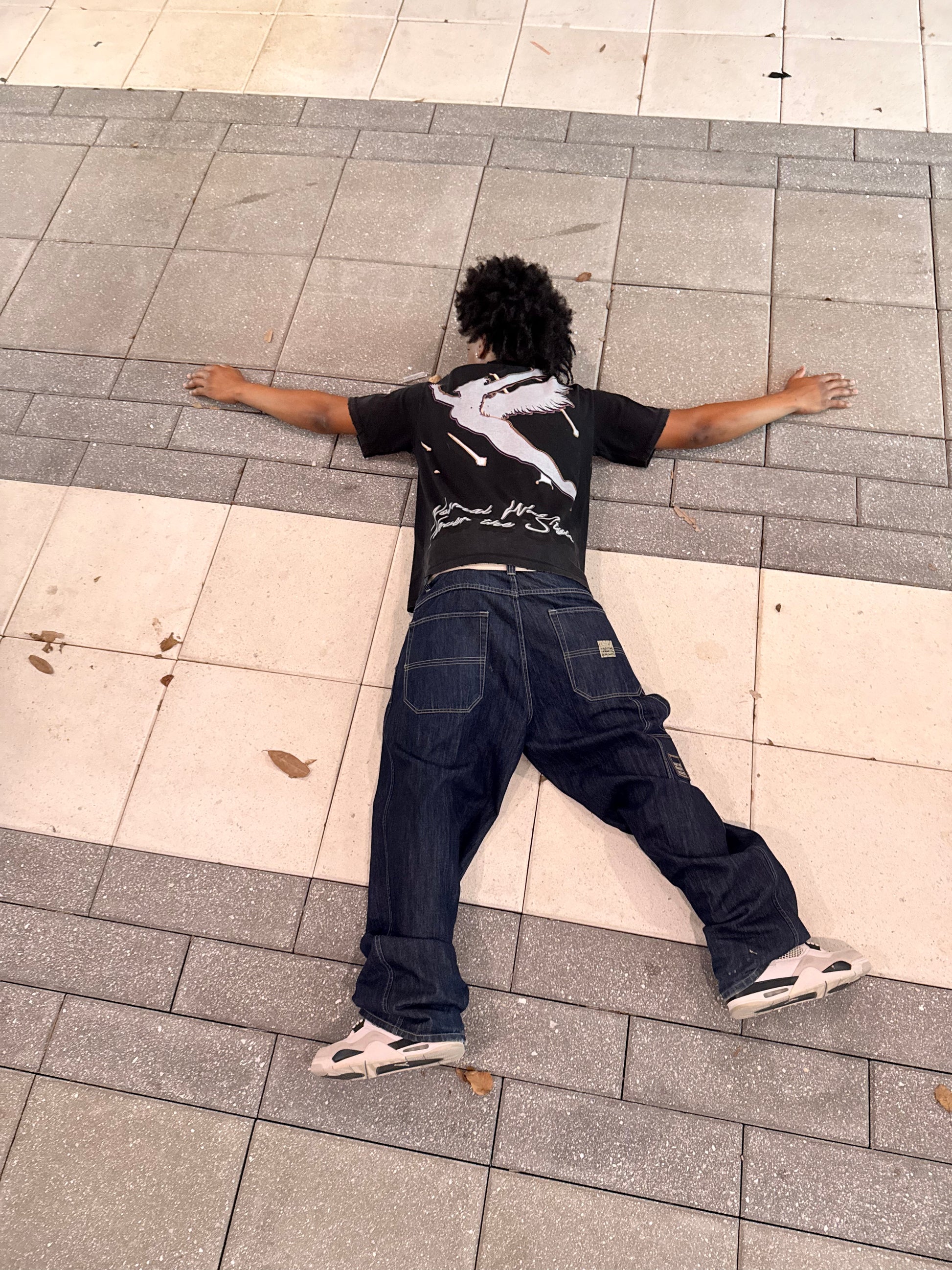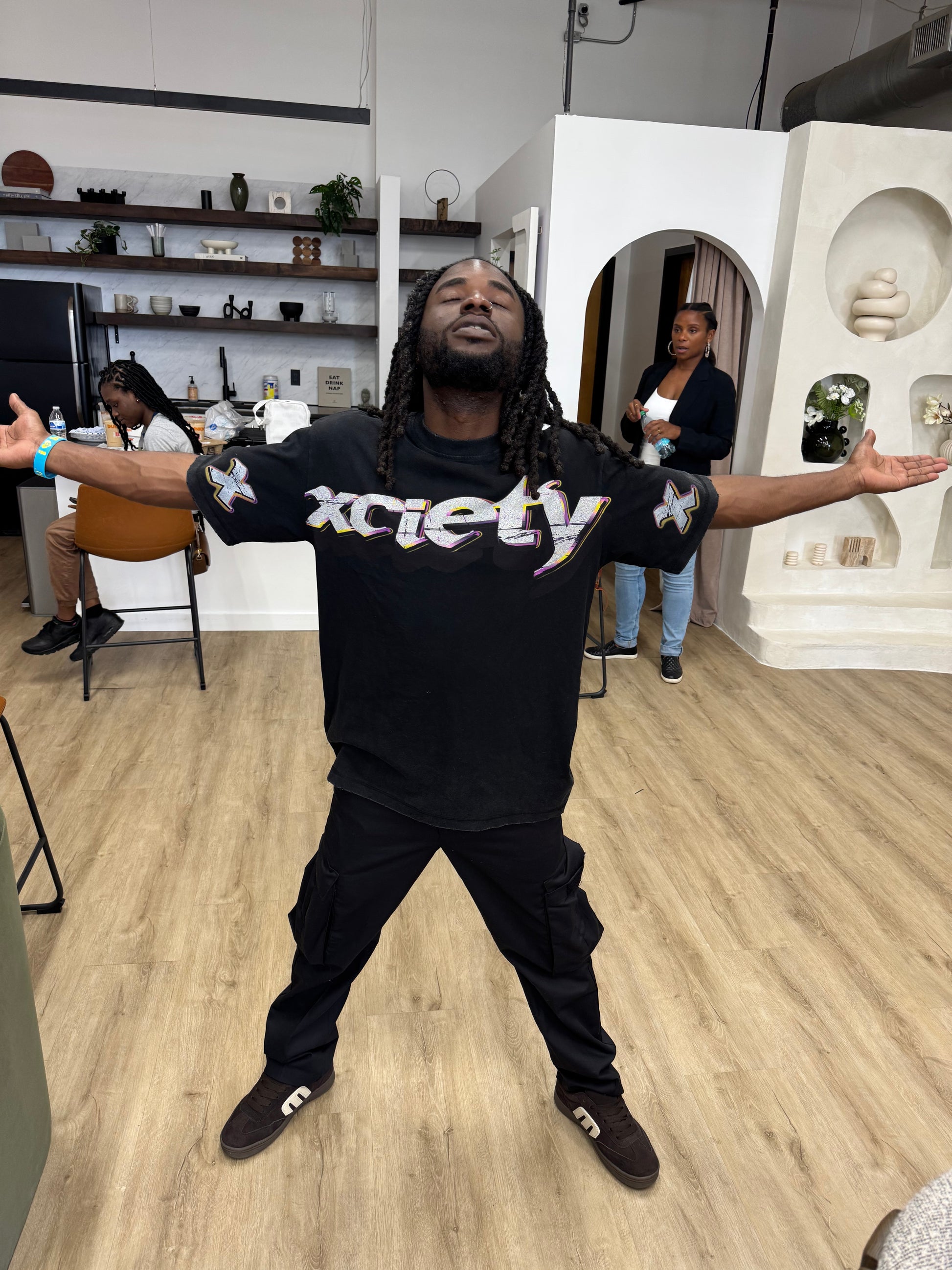 Shirt is made out of 250 GSM heavyweight cotton, with a sun faded and distressed effect to it made in China. This piece entails Xciety printed across the chest with the brand logo angel flying across the back.