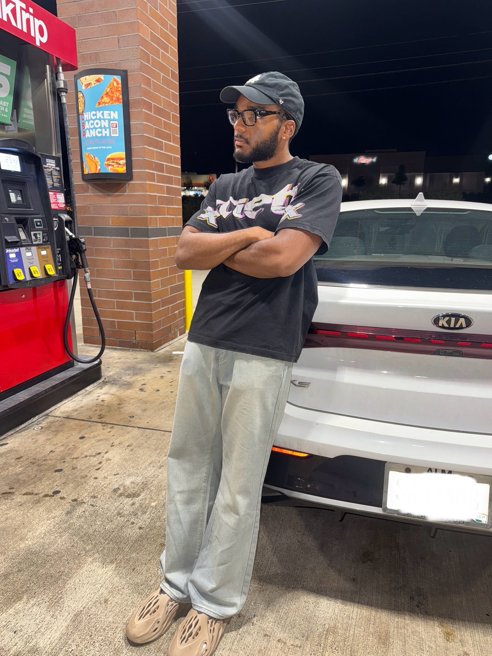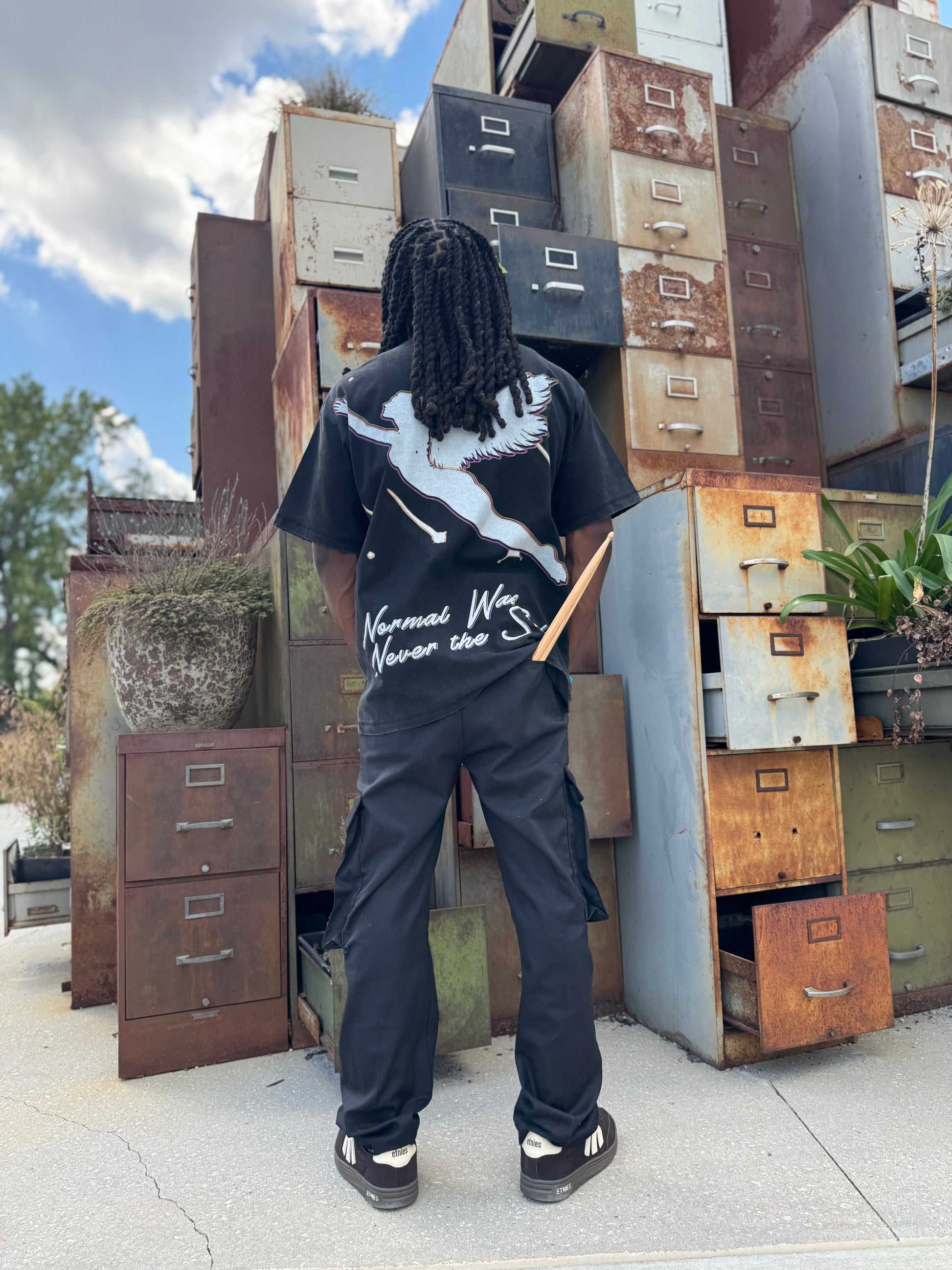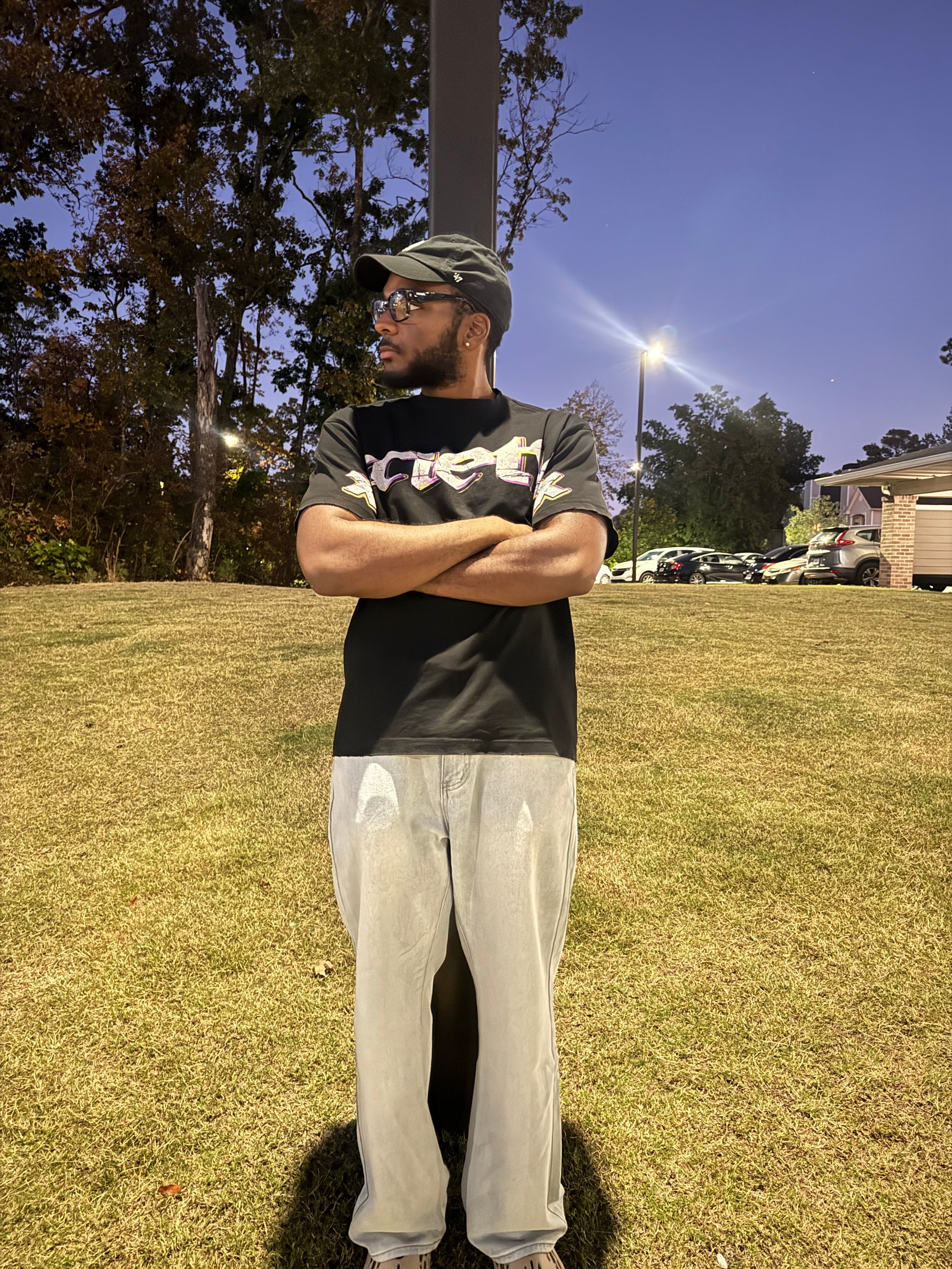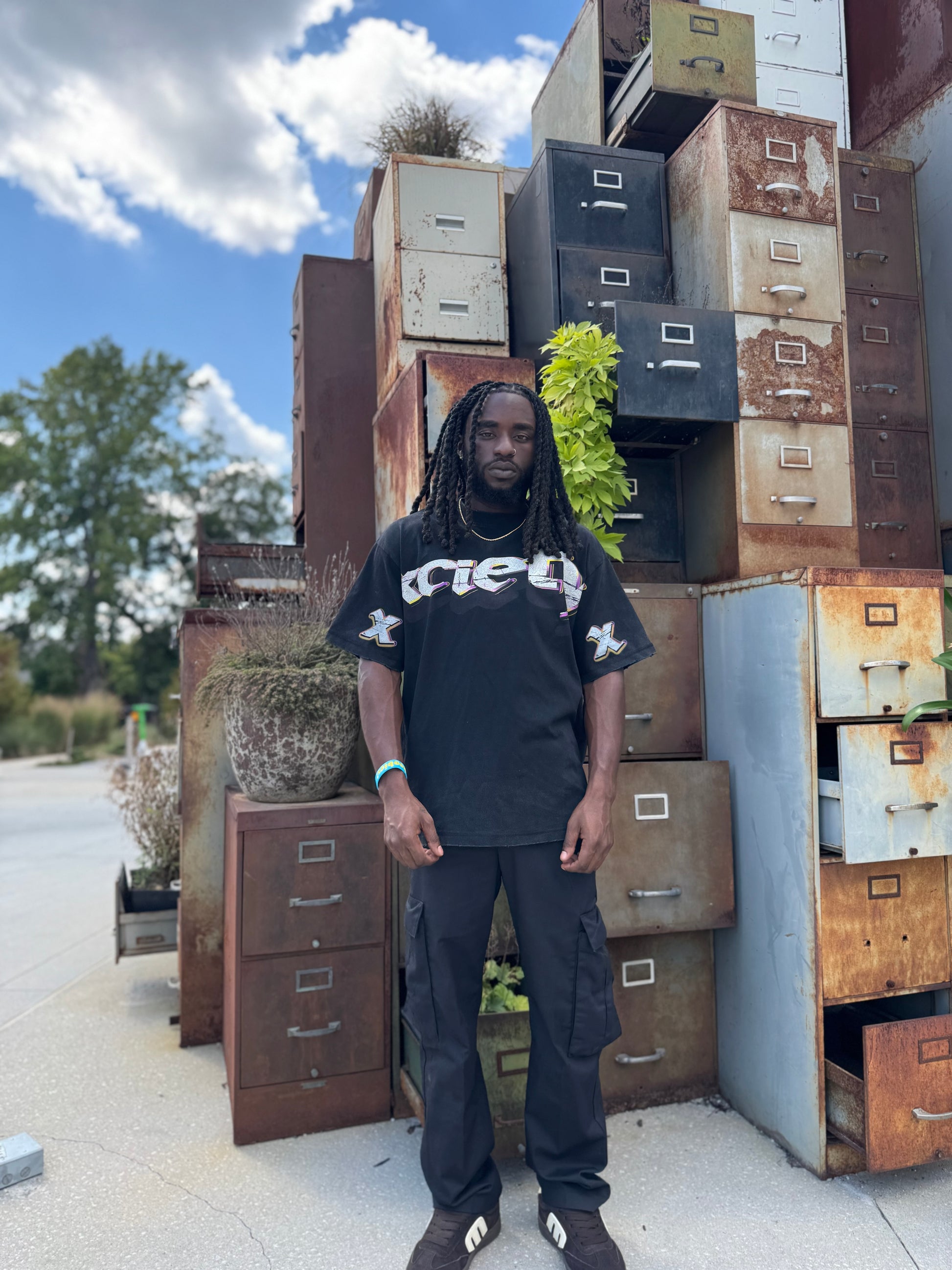 Shirt is made out of 250 GSM heavyweight cotton, with a sun faded and distressed effect to it made in China. This piece entails Xciety printed across the chest with the brand logo angel flying across the back.